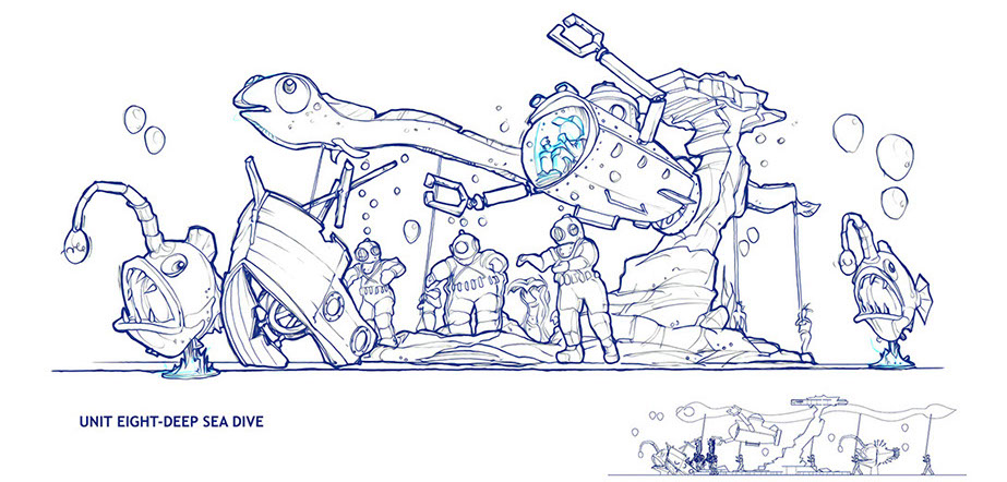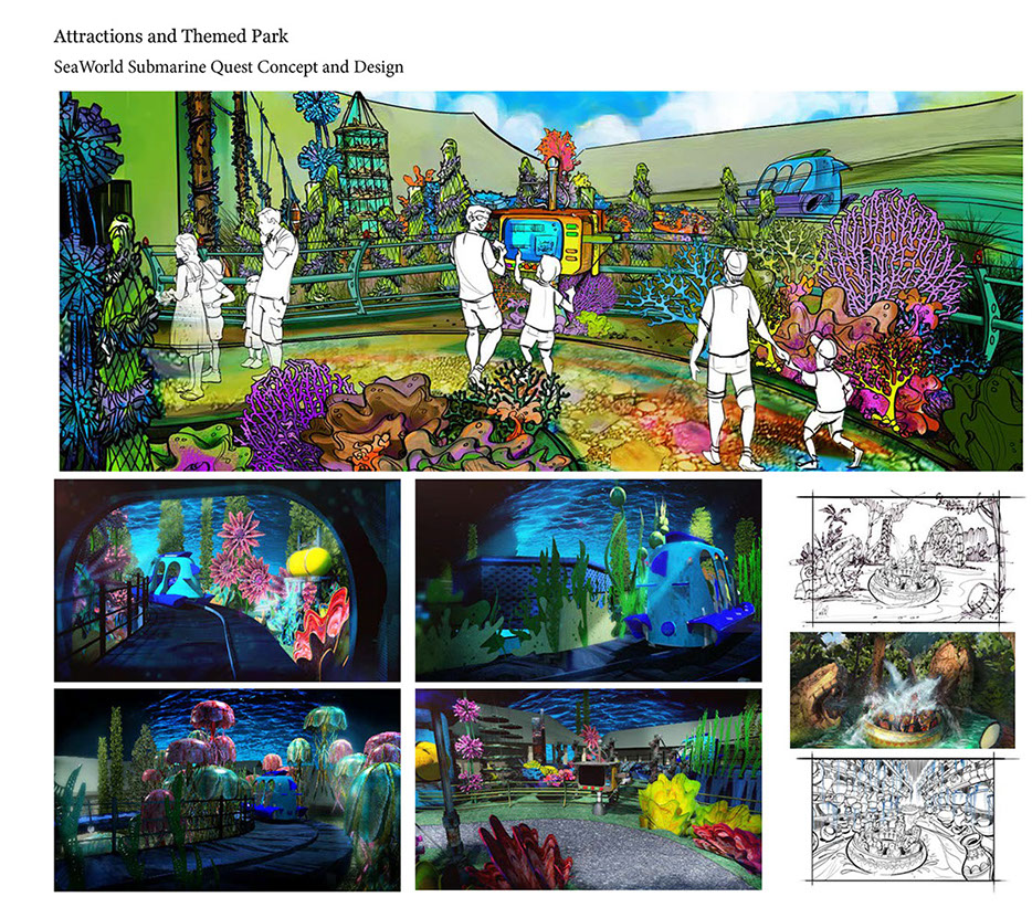 Here are samples some of the concept renderings and schematic drawings for dark rides, walk thru attractions, signage, aquarium re-themeing for events and attractions worldwide.